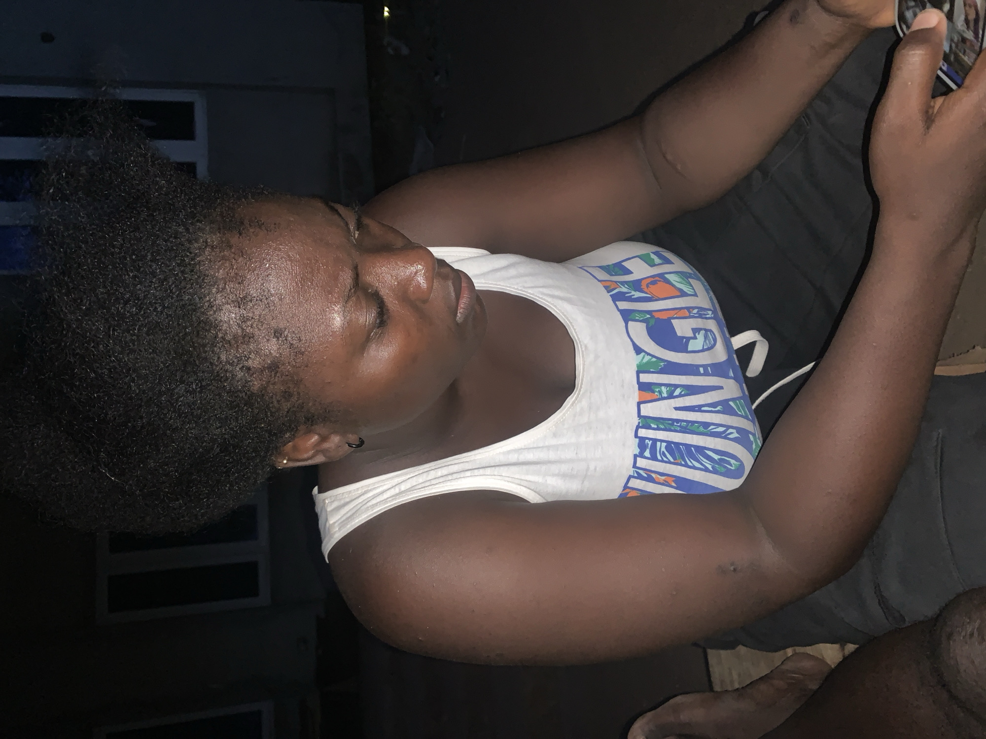 dark-skinned person in an unknown city, looking down at a mobile phone. The person is wearing a white tank top with a blue and orange design. Their arms are raised, holding the phone. The background is dark, with a building visible on the left side.
