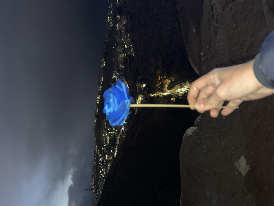 A human hand, visible from the wrist up and wearing a dark blue sleeve, holds a single blue, artificial rose on a light-colored stem, positioned in the lower-center foreground. The rose exhibits a vibrant, uniform blue color and is in sharp focus. The hand is observed from an elevated, dark, rocky vantage point. In the background, a panoramic nighttime view of Dummar Municipality, Syria, is visible. The city occupies a valley, displaying numerous illuminated buildings and streetlights. A brightly lit road prominently curves through the lower central area of the cityscape. The surrounding hillsides are dark and unlit. The sky above is heavily overcast with dark clouds, indicating either late dusk or night conditions.