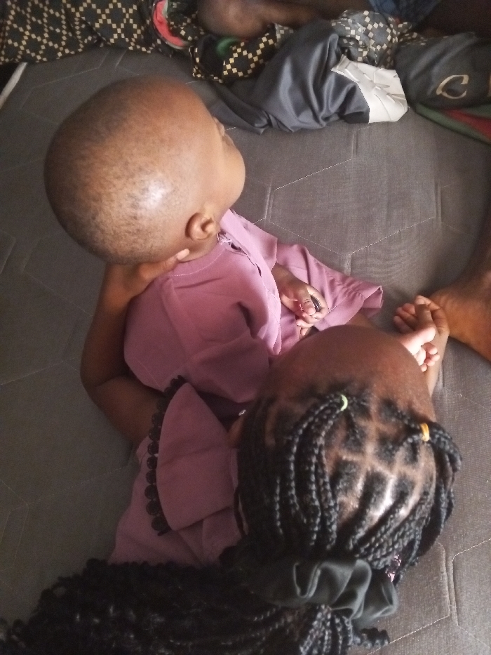 The scene is set indoors in Lokoja, Nigeria, depicting two individuals lying on a grey, padded surface with a hexagonal stitch pattern. Subject 1, a toddler or young child, is positioned on the left, lying supine with their head tilted upwards and slightly to the right. This individual has a closely shaved or balding dark head and wears a plain, long-sleeved mauve garment. Their left hand holds a small, dark, cylindrical object. Subject 2, an older child, is positioned to the right, also lying supine with their head turned towards Subject 1. This individual has black braided hair styled in square sections, secured with small yellow-green elastic bands, and a black scrunchie visible at the back of the head. They wear a mauve garment featuring black scalloped trim on the sleeve, similar in color to Subject 1's attire. Subject 2's left arm is extended towards Subject 1, resting across Subject 1's upper body. Bare feet are visible on the right side of the frame. In the upper right background, a disordered pile of clothing is visible, including a dark grey garment, a fabric with a black and gold/yellow geometric pattern, and fragments of green and red fabric.