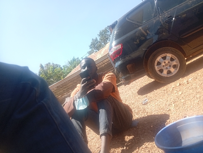 This image depicts an outdoor scene in Jos, Nigeria, under bright daylight conditions. An adult male with dark skin is seated barefoot on reddish-brown gravelly ground in the mid-ground. He wears an orange-brown long-sleeved shirt and dark trousers, holding a black smartphone with both hands while observing its screen. A light blue surgical face mask hangs from his left ear, resting against his neck. To his right, a dark-colored minivan or SUV, possibly black or dark blue, is parked on a slightly elevated section of similar reddish-brown ground. The vehicle's rear left wheel, featuring silver alloy rims, and a portion of its rear body are visible, showing some signs of dirt or mud on the rear quarter panel. In the background, green trees and a low-lying structure with a light-colored roof or awning are present. The lower torso and legs, clad in dark blue jeans, of another individual are partially visible in the left foreground, indicating a low-angle perspective from someone seated or crouching. A light blue plastic bucket or basin, partially filled with a clear liquid, is positioned in the lower right corner of the frame.