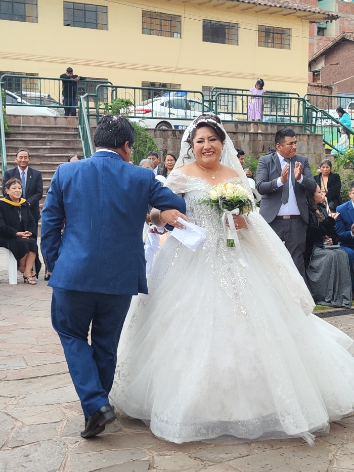 A wedding celebration unfolds outdoors on a stone-paved area. The bride, radiant in a white, ornate ballgown, holds a bouquet and smiles as she walks with a man in a blue suit. Guests are seated nearby, some applauding. A tiered, yellow building with windows is visible in the background, featuring a metal railing and steps leading to an upper level where people are standing. A white police vehicle is parked in the vicinity.