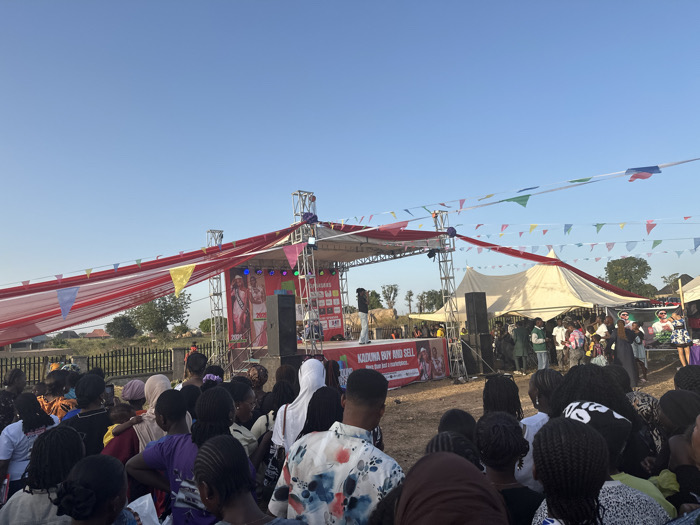 This image depicts an outdoor event in Rido, Nigeria, under a clear blue sky. A temporary stage, constructed from metal scaffolding with a red fabric canopy, is the focal point. A male individual in dark attire is standing on the stage, holding a microphone. Large speakers flank the stage. A banner at the rear of the stage displays images of two women and the year "2023," while a banner on the stage's lower front reads "KADUNA BUY AND SELL." Multicolored triangular pennant banners are strung across the event space. A large crowd, primarily composed of women, is gathered on unpaved ground, facing the stage. To the right of the stage, a large white tent is visible. In the background, beyond a metal fence, trees and distant buildings are present.