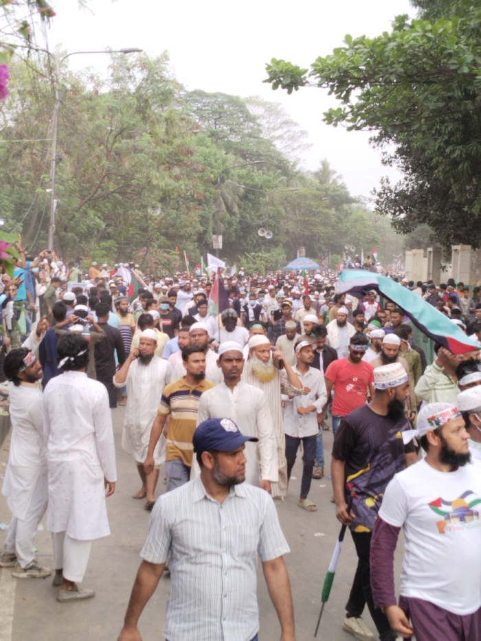 large crowd of people walking down a street in Dhaka, Bangladesh (latitude: 23