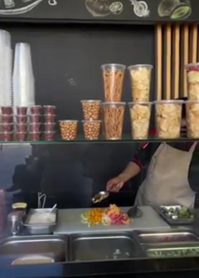 A person wearing a chef's coat is preparing food behind a counter. The counter has various small containers holding different ingredients or garnishes, and cups filled with snack foods line the shelves above the counter. The person uses a spoon and knife to chop and mix the ingredients on a white cutting board. A menu is written on a blackboard behind the counter.