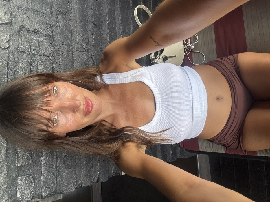 A woman with hazel eyes and bangs poses for a selfie. She wears a white ribbed tank top and brown shorts. A small silver hoop earring is visible in her left ear, and she has a nose ring. In the background, a black brick wall contrasts with a bag, keys, and headphones. Her arms frame the shot, with a tattoo visible on her left forearm.