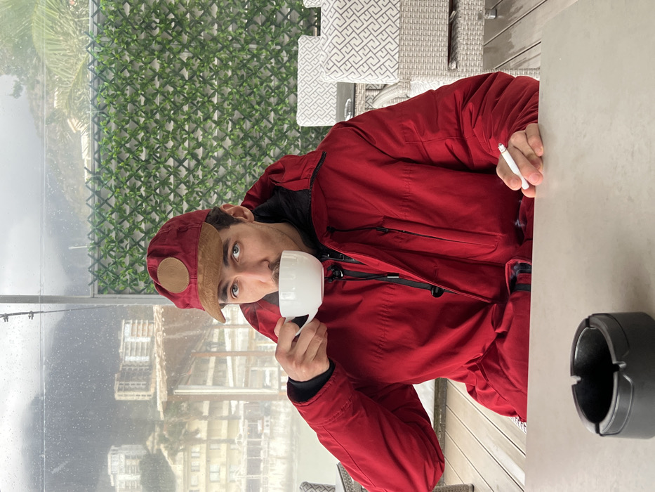 A male individual is seated at a light-colored table within an enclosed outdoor seating area, likely a cafe or restaurant terrace, in Budva, Montenegro. He is observed bringing a white ceramic cup, emitting steam, to his mouth with his right hand while looking directly forward. He wears a red hooded jacket over a dark hoodie and a red baseball cap with a circular brown patch and brown brim. A dark mustache is visible on his face, and his eyes are blue. His left hand, resting on the table, holds a lit cigarette. A black, circular ashtray is positioned on the table to his left. The background, visible through a clear panel marked with rain droplets, shows a view of Budva. Multi-story buildings are clustered on a green hillside, sloping towards a body of water, indicative of a coastal marina or bay with visible boats. Mountains are present under an overcast sky. To the right of the subject, a wall covered with artificial green foliage in a lattice pattern is visible. White wicker-style chairs with patterned cushions are partially visible in the seating area. The floor appears to be light-colored wooden decking. The environmental conditions are overcast and rainy.