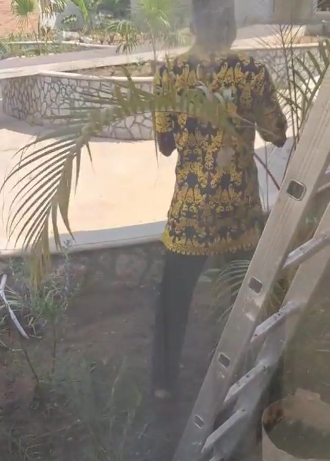 person in a black and yellow patterned top, holding plants, standing in a yard with a newly constructed or renovated area. The person walks away from the camera, then the camera moves to focus on the environment. There is a ladder standing against what seems to be a window. Outside, the yard includes a light-colored, oval-shaped area surrounded by a low stone wall, possibly a pond or decorative feature. Small palm trees and other plants are visible in the yard. In the background, a modern white building with a brick accent is seen. The sky is visible, indicating an outdoor setting.