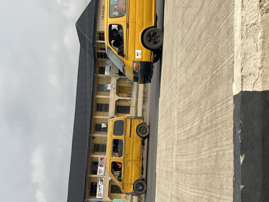 The scene depicts a street in Ajara, Nigeria. Two yellow passenger vans are present on a paved road, positioned to move rightward or stationary. The van on the left is a compact, heavily weathered yellow minivan, exhibiting dents and missing side window panels. Its driver, wearing a red garment, is visible. The van on the right is a larger, newer yellow van, featuring a black front bumper, with at least two occupants visible in the front seats. A reddish-brown object is discernible in its rear compartment. All four visible wheels on both vans are black. In the background, a two-story commercial building with a light-colored facade and a dark corrugated metal roof is visible. The building is identified by a sign reading "E&D PLAZA" on its right side, and another sign on the left advertises "MOBILE & COMPUTER ACCESSORIES." The sky above is overcast. The immediate foreground features a concrete surface with prominent parallel linear textures.