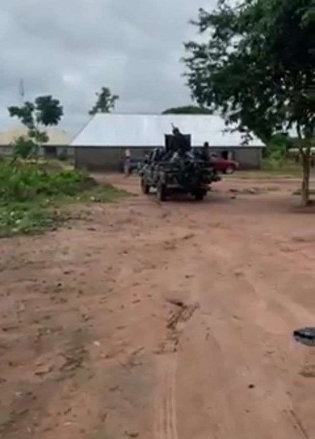 muddy, red dirt road in what appears to be a rural area. A pickup truck filled with people drives away from the camera, moving towards a building with a silver roof. There are other vehicles parked near the building and a few people standing near the truck as it departs. The sky is overcast and there is some greenery around the road and buildings.