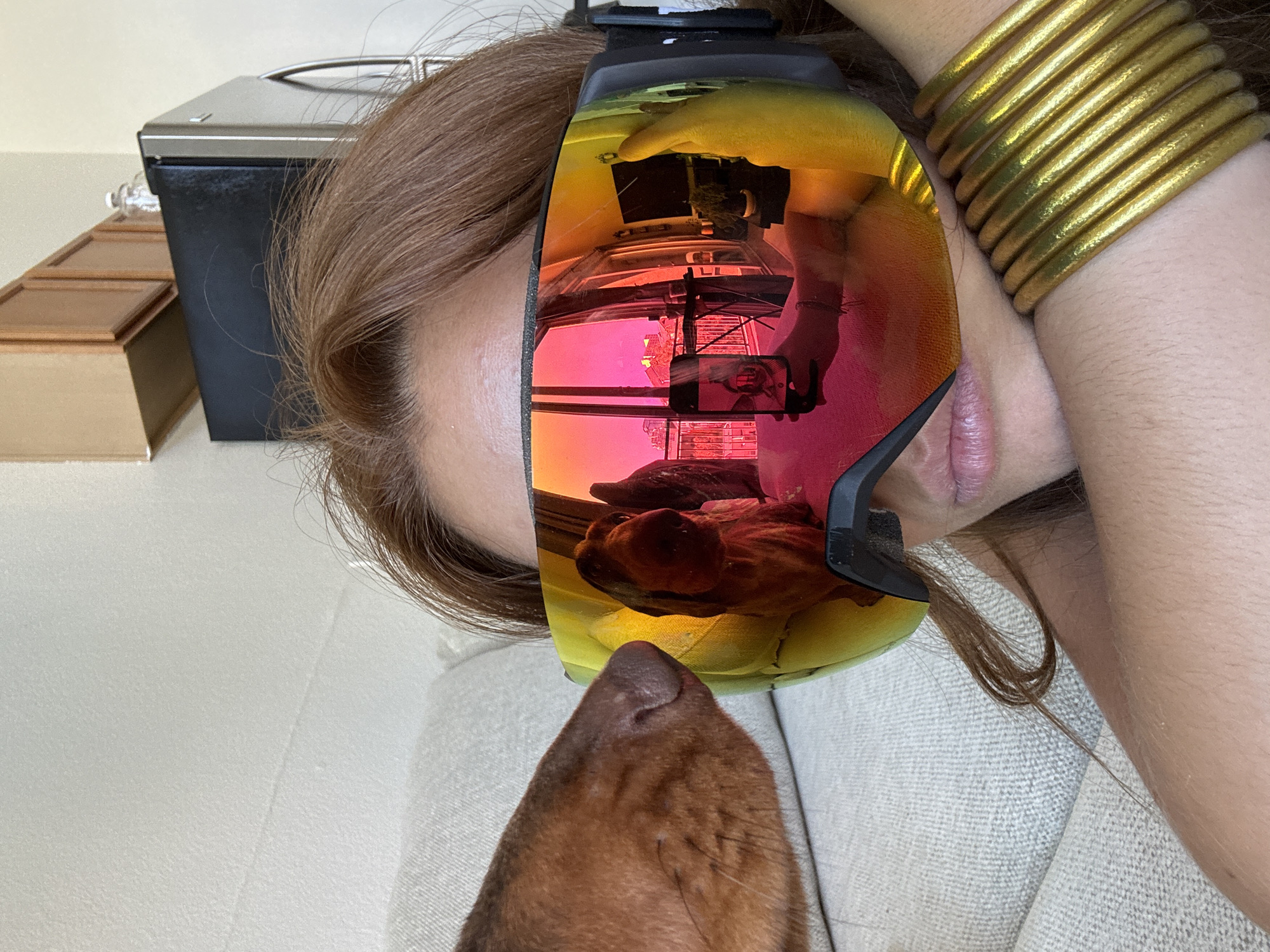 The image displays an indoor scene located in San Diego, United States of America. The primary subject is an adult individual with reddish-brown hair, whose face is partially obscured by large, iridescent ski or snowboard goggles reflecting tones of yellow, orange, and pink. The individual's mouth and chin are visible below the goggles, and multiple gold-colored bangles are worn on the left wrist. Positioned to the immediate left of the individual's face, a reddish-brown dog's snout and nose are visible in the foreground, approaching the goggles. The reflection in the goggles provides a panoramic view of the immediate surroundings and an external environment. Within the reflection, the individual's left hand is seen holding a black smartphone, indicating a selfie is being taken. The reflection extends to an outdoor balcony with railings, beyond which an urban skyline featuring numerous buildings, including high-rises, is visible. The sky in the reflection shows a prominent sunset, characterized by strong pink, orange, and red coloration. A large body of water, consistent with a bay or ocean, is discernible in the distance, reflecting the sky's hues. A distinct reflection of a dog is also present within the left goggle lens. The background behind the individual features a light-colored, textured upholstered couch on the left. To the right, a portion of a kitchen area is visible, including a stainless steel refrigerator with a dark-colored door, light brown wooden upper cabinets mounted on a wall, and a clear glass bottle resting on top of the refrigerator. The interior walls are light-colored.