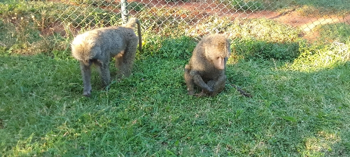 The image displays two baboons situated within a grassy area in Athi River ward, Kenya
