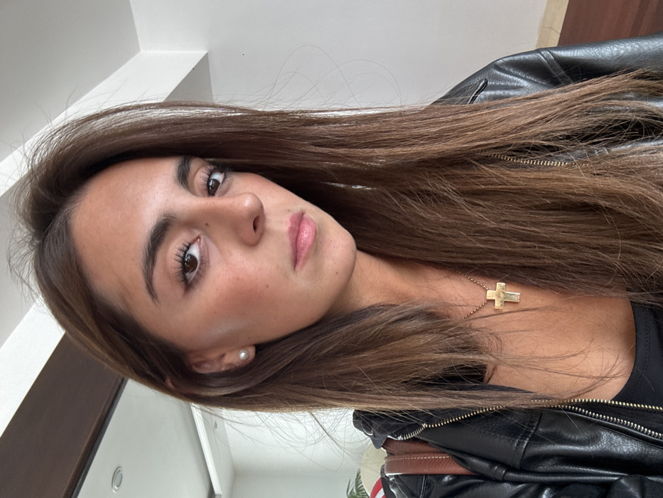 An adult female subject is centered in a chest-up portrait, facing forward with a direct gaze toward the camera. She possesses long, straight, dark brown hair that extends over her shoulders and chest. Her features include brown eyes, well-defined eyebrows, and visible light facial makeup, including a blush on the cheeks and a pinkish tint to the lips. She wears a black faux leather jacket with a visible zipper over a dark undershirt. Accessories include a single white pearl stud earring in her visible left ear and a gold-toned, solid cross pendant on a thin, beaded chain around her neck. A brown strap, consistent with that of a bag or backpack, is partially visible over her left shoulder. The background is an indoor environment characterized by a plain, light-colored wall and a white ceiling featuring recessed lighting fixtures. In the upper left background, a partial view of a green-leafed plant and a light-colored decorative object are discernible. The precise location within Interlomas, Mexico, is not discernible from the visual evidence within the image.