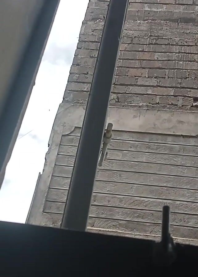view from inside a building, looking out through a barred window. The focus is on the window frame and the brick wall of the building outside. A portion of the sky is visible in the background. There are no people visible in the video.