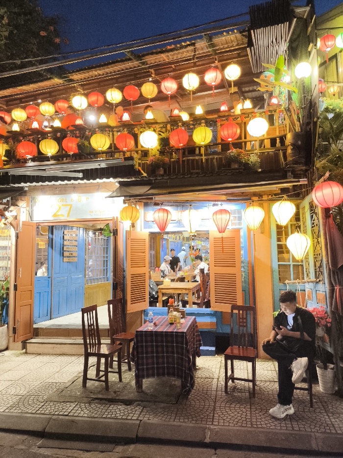 The image depicts a nighttime street scene in front of a multi-story building operating as a restaurant, located in Hội An Ward, Vietnam. The building's facade and a second-story balcony are extensively decorated with numerous illuminated spherical and teardrop-shaped lanterns in red and yellow hues. A sign displaying "27" and "Restaurant BEP" is visible on the upper left section of the first floor. At street level, a patterned grey sidewalk occupies the foreground. An outdoor seating area consists of a square wooden table draped with a red and black plaid tablecloth, upon which a bottle of water and other small items are placed. Three dark wooden chairs are arranged around this table. On the right side of the frame, a young male individual is seated on one of the outdoor chairs. He wears a dark shirt, dark pants, and light-colored sneakers with "BOSTON" visible on one shoe. His left leg is crossed over his right knee as he actively engages with a smartphone held in both hands. Through the building's open wooden doors and window shutters, which feature blue and orange coloration, the brightly lit interior of the restaurant is visible. Multiple patrons are seated at wooden tables inside, engaged in dining or socializing. The sky above is dark, indicative of evening or night. Overhead, several electrical wires traverse the scene.