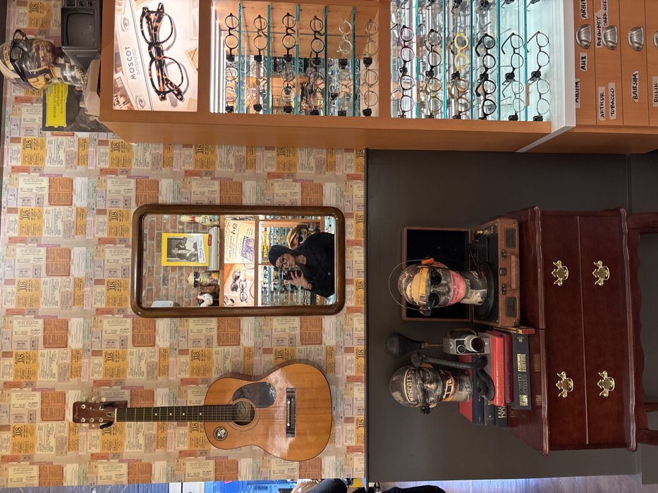 This image showcases an eclectic mix of vintage and modern elements. Eyeglasses are displayed above ticket-themed wallpaper. A mirror reflects a person holding a camera, surrounded by framed pictures and retro decor. Below the mirror, a guitar hangs on the wall. A dresser holds a vintage case with a mannequin head, an old camera, and books. The scene features a blend of fashion, music, and antique collections.