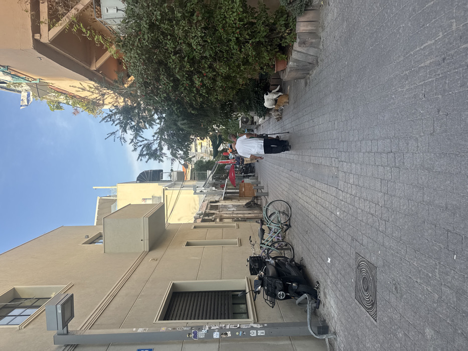 The image depicts a paved alleyway or narrow street in Tel Aviv, Israel, under a clear daylight sky
