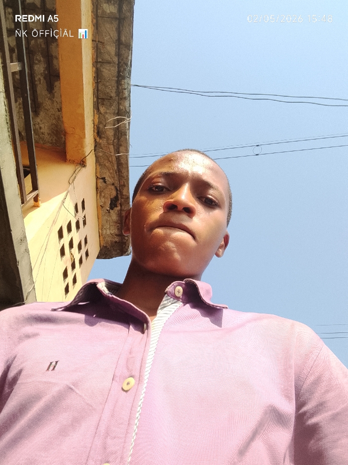 A low-angle selfie captures a young man with a clean-shaven head. He is wearing a light purple collared shirt. The sky is clear and blue. Part of a building's exterior wall is visible, painted in shades of yellow, with small, square windows. The top-left corner shows camera information and a username with an emoji, while the top-right corner shows a timestamp.