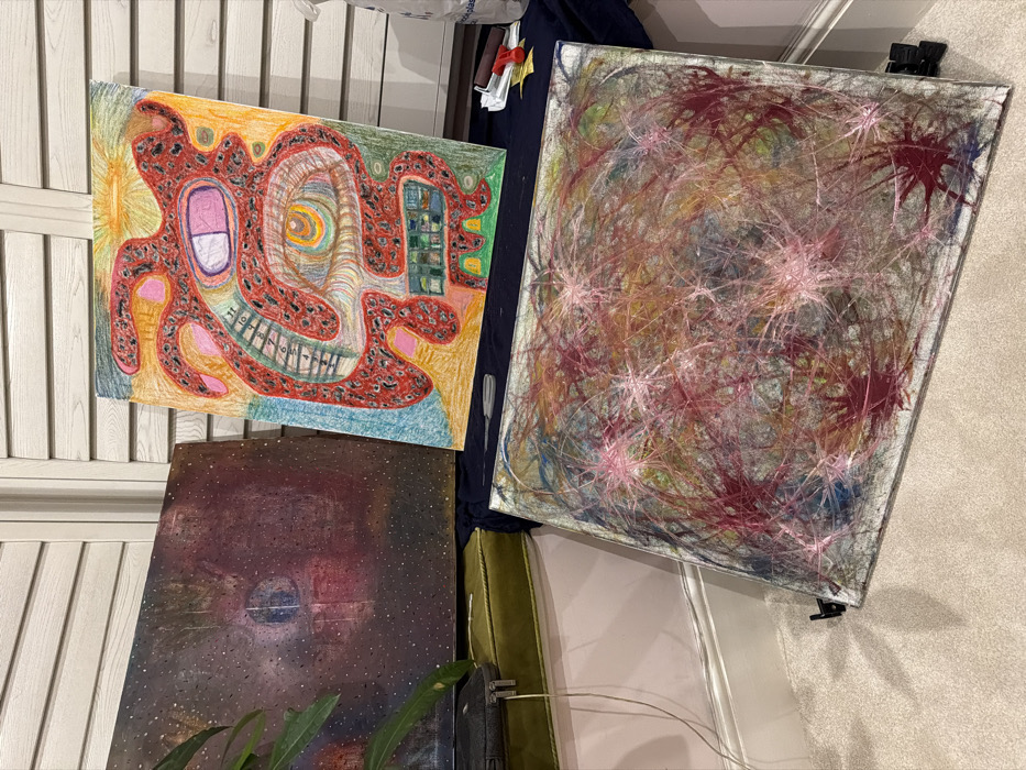 The scene depicts an indoor setting, an unidentifiable room in the city of London, United Kingdom. Three abstract artworks are prominently displayed. The artwork in the top left is a rectangular canvas, oriented horizontally, featuring a dark, textured background primarily in deep maroon and black tones, punctuated by numerous small, scattered white or light-colored specks. A central, blurred circular element with a lighter core is faintly visible. Leaning against a light-colored, paneled wall (resembling interior shutters), the top-right artwork is a vertical rectangular drawing or painting. It exhibits an intricate, organic, multi-lobed shape predominantly in red with black stippling, outlined in blue and pink. Distinct features include a large, stylized eye with concentric rings, a mouth-like structure with white teeth, and a series of numbers (1 through 11) arranged on a curved, ladder-like segment within the red form. Bright yellow and orange fill parts of the background, along with a teal/green section at the bottom. On the floor, in the foreground, a large square abstract painting lies horizontally. This artwork is characterized by a dense network of thin, tangled lines in various colors, including blues, greens, yellows, oranges, and grays, with prominent "starburst" or "splatter" motifs in shades of pink and deep red distributed across the surface. The environment includes a short-pile, light-beige carpeted floor and a white baseboard along the wall. To the left, a dark green velvet-like cushioned object (possibly a trunk or stool) partially supports the top-left artwork. A black zippered case with an attached white charging cable rests on this green object. A dark green plant is partially visible in the lower-left corner, obscuring a small portion of the scene. A dark blue fabric is draped over the green object and extends rightward, serving as a surface for several items: a white plastic bag, a small red object, a gray roller or brush, a yellow implement (possibly a scraper), and a small wooden block. No individuals are present in the image.