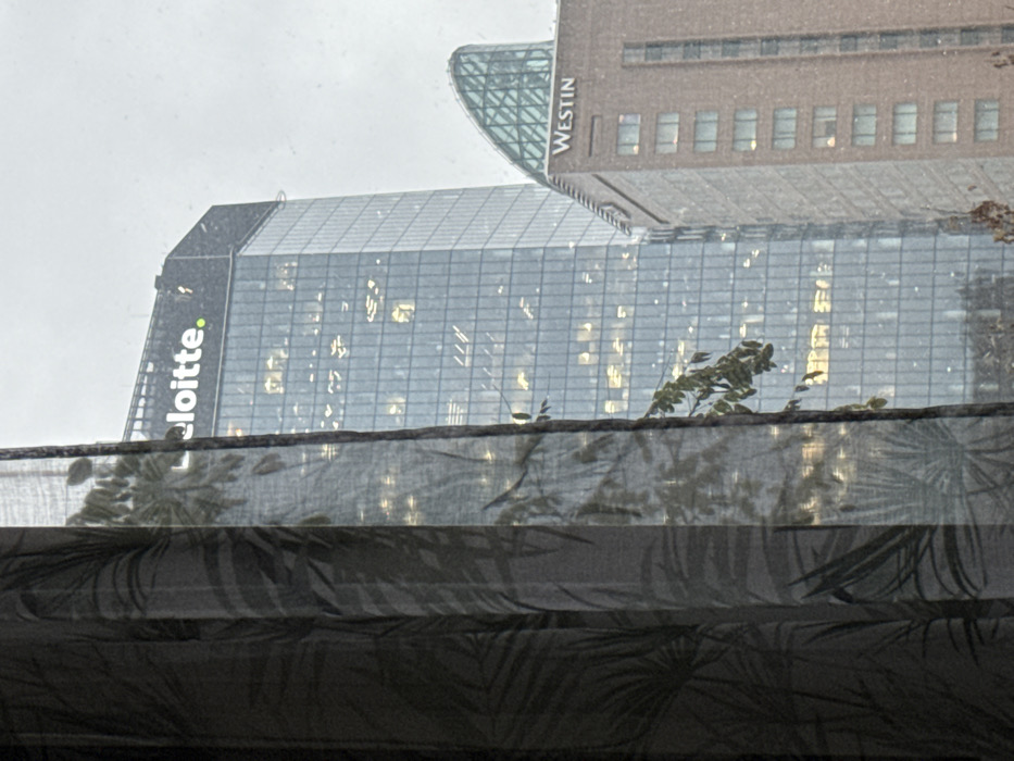 The image displays an urban scene in Warsaw, Poland, viewed from an interior perspective through a window. The left portion of the frame is occupied by a dark gray curtain, patterned with repeating botanical motifs, partially obscuring the outdoor environment. Beyond the curtain, green foliage is visible. The central subject is the Deloitte building, a modern glass-facade high-rise located at Plac Europejski 1. Multiple interior lights are illuminated across its floors. To the right of the Deloitte building, the Westin Warsaw hotel, a brown brick building at al. Jana Pawła II 22, is visible, featuring a distinctive curved glass-paneled structure on its roof. The sky is overcast and light gray, indicative of a cloudy daytime, with faint airborne particles. No individuals are visible.