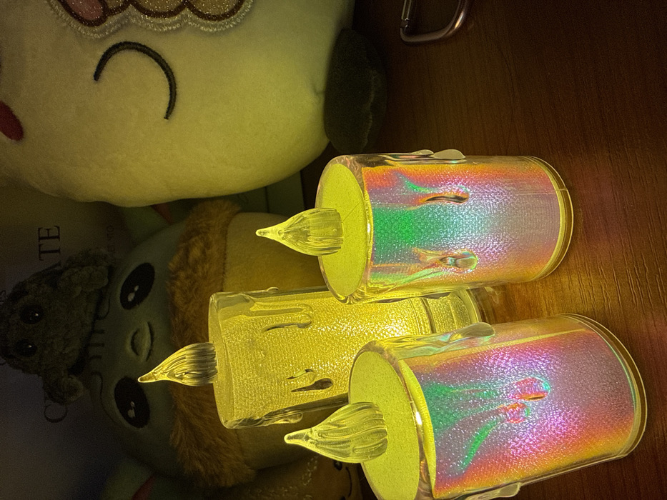 This image depicts an indoor scene in Dmitrov, Russia, featuring three illuminated LED candles and two plush toys on a dark brown wooden surface. In the foreground, a taller, translucent yellow LED candle resembling a melting wax pillar stands centrally. It is flanked by two shorter, cylindrical LED candles. These shorter candles have iridescent, rainbow-hued bodies with clear plastic "melted wax" drip embellishments. All three candles feature clear, stylized flame toppers that emit a steady yellow light. The background displays two plush toys: to the left, a light-green Grogu-like character with a small, dark-colored plush object on its head is partially visible. To the right, a large, pale-colored plush toy with a dark, curved stitched eye or feature is present. The scene is dimly lit, with the artificial light from the LED candles providing the primary illumination.