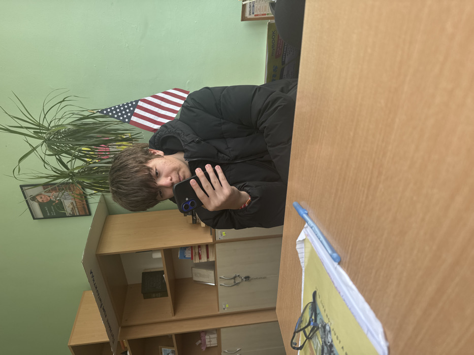 An indoor scene in Asenovgrad, Bulgaria, depicts a young male seated at a light-colored wooden desk, looking intently at a black smartphone held in both hands. The male has light brown, medium-length hair and is wearing a black puffer jacket. On the desk in the foreground, to the left of the male, lies a yellow notebook or folder, a blue ballpoint pen, and a pair of black-framed eyeglasses. The background features a light green wall. To the left, a modular light brown shelving unit with various books and small objects is visible. A white sign with Cyrillic text ("ТЪРГОВИЯ КЪМ ИНТЕЛЕКТУАЛА") is affixed above one section of the shelving unit. To the right of the male, a tall, leafy green potted plant stands against the wall, partially obscuring an American flag hanging below it. A framed cartoon image is also mounted on the wall. Further to the right, a small shelf contains an "ENGLISH" textbook. The room is uniformly lit.