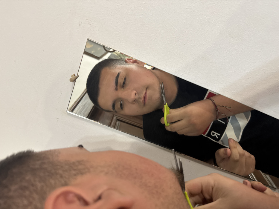 A male individual is depicted indoors in Shumen, Bulgaria, observing his reflection in a rectangular mirror affixed to a white, textured wall. The mirror is secured at the top by a small, light-colored animal figurine. The individual, visible partially in the foreground from the right profile and fully in the mirror's reflection, has short dark hair and a faint earring in his left ear. He is wearing a dark t-shirt with a horizontal striped pattern and a reversed logo/text on the chest. A multi-strand bracelet is visible on his left wrist. He is holding a pair of small scissors with bright yellow handles in his left hand, positioned near his chin/jawline, suggesting an action of trimming facial hair. His gaze is directed downwards towards the area where the scissors are positioned. The reflection also shows part of an interior room in the background, including a framed item on a wall.