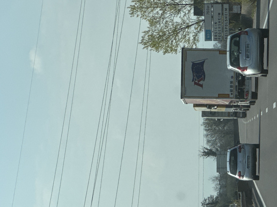The image depicts a daytime view of a multi-lane highway in France, specifically on the M83 route approaching Illkirch-Graffenstaden, as indicated by a roadside sign displaying "ILLKIRCH-GRAFFENSTADEN," "ERSTEIN," "FEGERSHEIM," and "GEISPOLSHEIM" with a "750m" distance marker. The sky is light blue with minimal cloud cover. Several vehicles are present on the asphalt highway, which features white dashed lane markings. In the left lane, a silver/light grey hatchback (French license plate partially visible as "FK-931-FB") travels ahead. In the right lane, a silver/light grey hatchback (French license plate "DY-225-BH") is positioned behind a line of commercial trucks. The foremost truck is a white semi-trailer unit with a large "K" logo incorporating a blue and white flag design on its rear, displaying numerical information "60 80 90" and a partially visible French license plate "DE-679-GB." A second truck is partially visible directly behind the first. Further vehicles are discernible in the distance. Overhead, multiple black power lines traverse the upper portion of the frame horizontally. The roadside environment includes green foliage and trees, some appearing bare, indicating a possibly late winter or early spring season. No individuals are visibly present outside of vehicles.