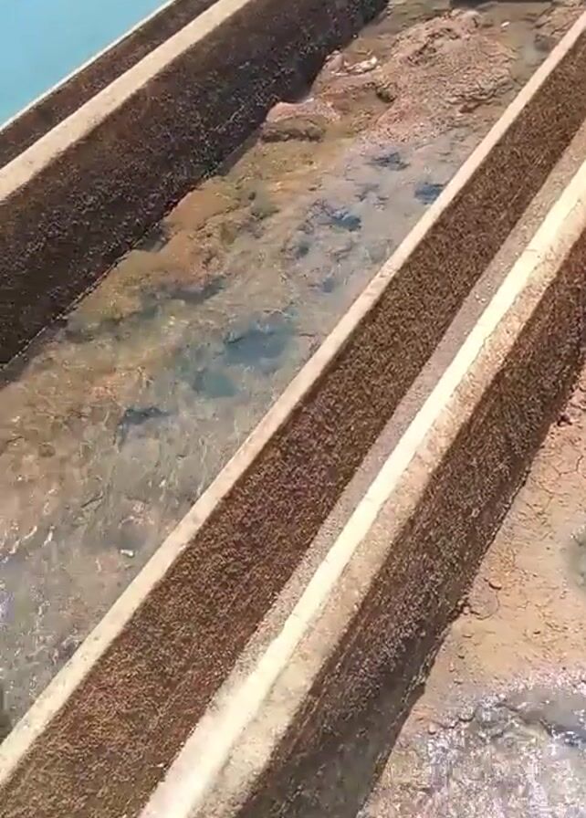close-up, eye-level view of a concrete structure with two parallel channels filled with water. The water is somewhat murky, and the channel bottoms are covered with a brownish sediment. The sides of the channels are textured and appear slightly discolored. A metal tool with a circular end is used to agitate the water and sediment in the channel. The surrounding area outside the channels is dry and cracked, showing a similar brownish material. In the background, a building can be seen. The audio contains the sound of flowing water.