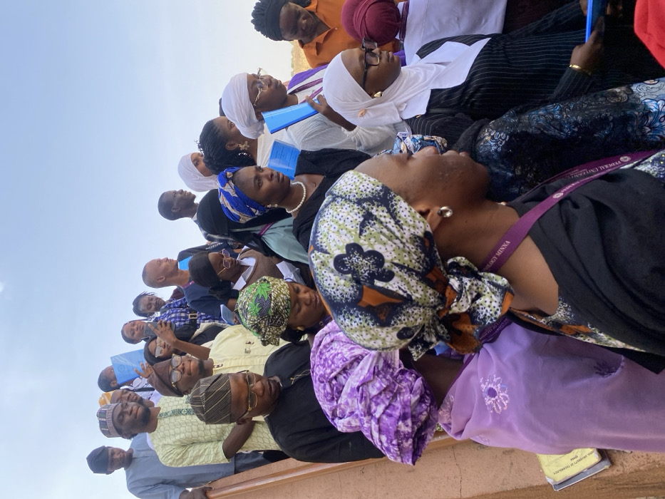 A diverse group of people sit outside, several wearing traditional head coverings. Most of the crowd faces the same direction, presumably listening to a speaker or event. A few individuals hold blue folders or notebooks. A woman in the foreground wears a printed headwrap and a purple lanyard that says "Federal University of Technology Minna." Others wear white or purple hijabs, and some men sport traditional Yoruba hats.