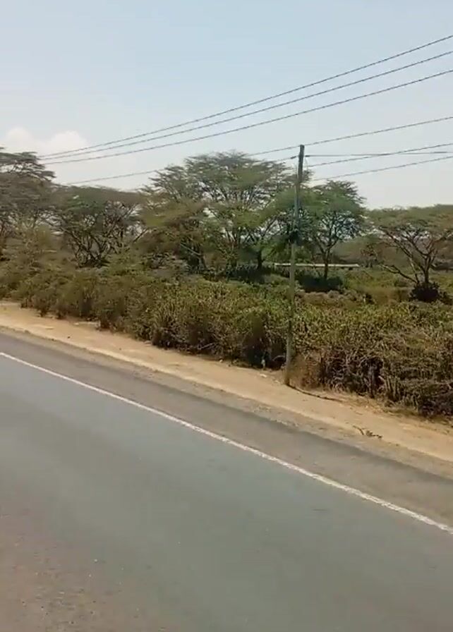landscape with a road. The road is gray with a yellow line painted on the side. On the right side of the road, there is an unpaved shoulder. Beyond the shoulder is dense vegetation of bushes and trees with a few utility poles. There are power lines strung between the poles. The sky is pale blue, indicating daylight. A person walks down the dirt area to the right of the road.