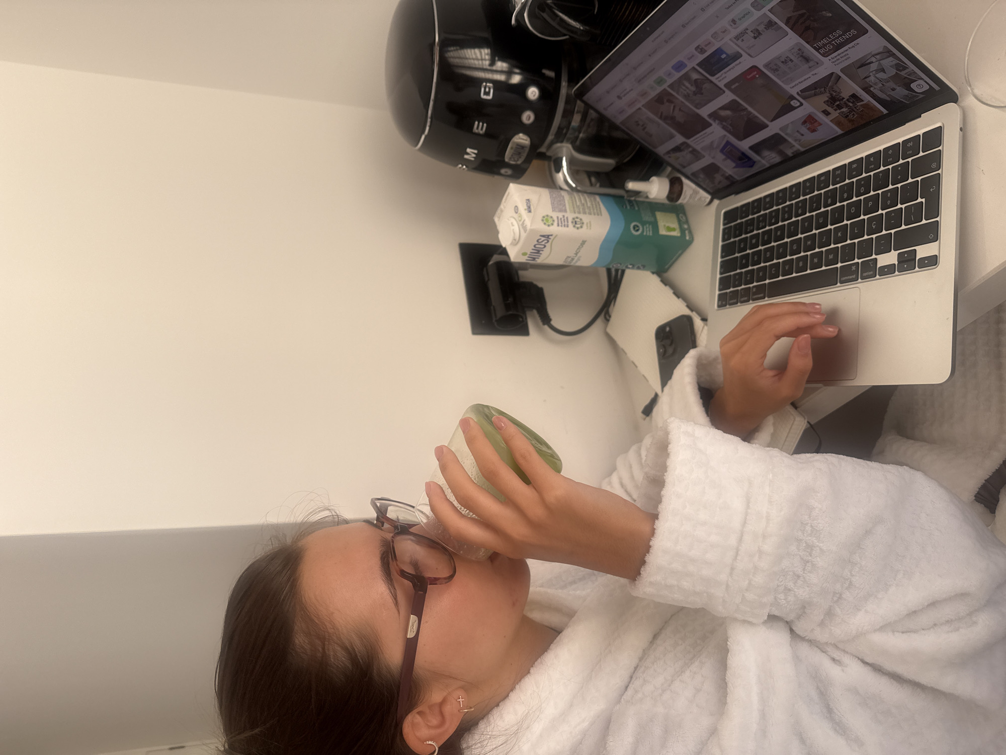 A person is seated at a white table in an indoor setting in Vila Nova de Gaia, Portugal. The individual, appearing to be a young female, is wearing a white terrycloth bathrobe and dark-rimmed eyeglasses. She is actively drinking from a clear glass containing a green liquid, holding the glass with her right hand. Her left hand rests on the trackpad of an open silver Apple MacBook laptop, which displays a webpage featuring various image thumbnails, including a section titled "TIMELESS RUG TRENDS." Arranged on the table, to the right of the person, are several objects. A black smartphone is partially visible on the far left. Next to it, a white carton of "MIMOSA sem lactose" (lactose-free milk) stands upright. Behind the milk carton, a black electrical outlet with a connected black plug is visible on the white wall. A small dropper bottle, possibly containing a cosmetic serum, is situated near the laptop. Further to the right, a black Smeg coffee machine with chrome accents is positioned against the wall. The immediate environment consists of plain white walls.