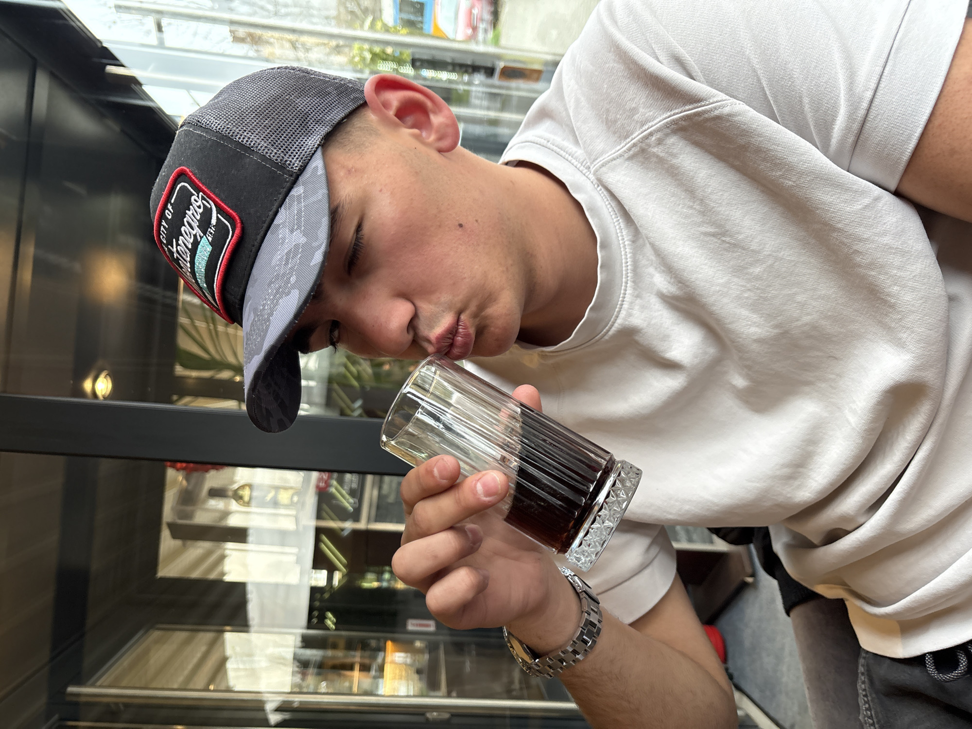 - "A young male, observed from the chest up, is seated indoors, holding a clear glass containing a dark brown liquid to his mouth" by FM-hmEBs2, licensed under CC BY 4.0