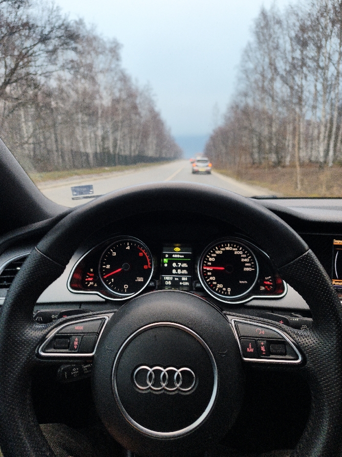 An Audi's steering wheel dominates the foreground, showcasing the brand's iconic four rings. Beyond the wheel, the dashboard displays key driving information: the odometer reads 170017, 6.7 is displayed. The speedometer indicates a speed around 75 km/h, while the fuel gauge indicates a full tank (400km). The view through the windshield reveals a straight road lined with trees on both sides, leading to a distant car. The sky is overcast, suggesting a cloudy day.