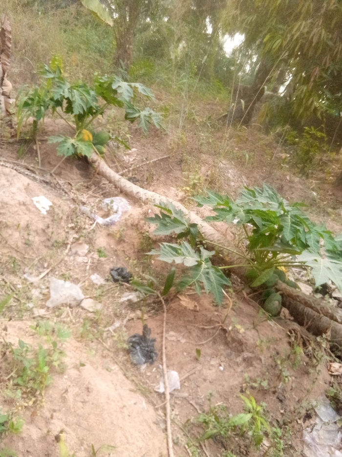Two papaya trees with green leaves and fruit grow horizontally from a log. The ground is brown and uneven, covered with scattered trash, including plastic bags and wrappers. Sparse vegetation and taller trees are visible in the background. The scene appears to be a neglected or disturbed patch of land.