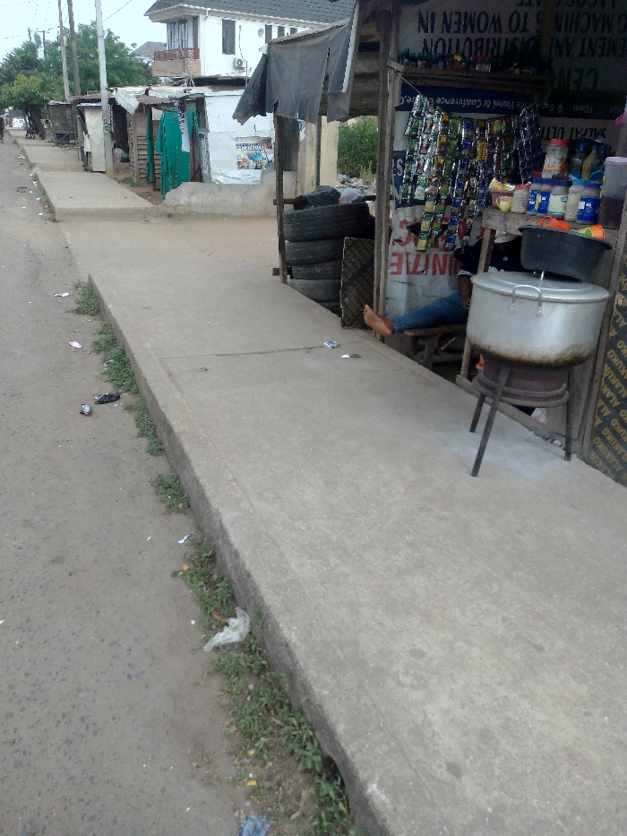 A street scene shows a row of small businesses or stands along a sidewalk. One stand has tires stacked up and is covered in various items for sale. Someone is sitting inside, visible only from the knees down. A large cooking pot on a stand sits in front. Signs and advertisements are visible on the stand's walls, mentioning "Cement and Distribution to Women" and "Salfat Ulti." The sidewalk is next to a paved road, with litter and weeds growing along the edge. A building can be seen in the background.