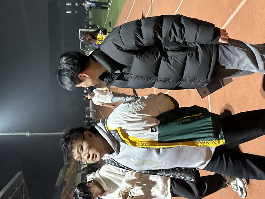 The image captures an outdoor athletic track and field at night in Jiangjin, China. The scene is illuminated by artificial lights, with a tall light pole visible on the left. The foreground features an orange-red running track with white lane markings. Adjacent to the track is a green artificial turf field with a white soccer goalpost in the mid-ground on the right. In the background, stadium seating with orange and yellow sections is discernible, along with distant buildings. Three males are prominent in the foreground, walking from left to right. The leftmost individual, partially visible, has dark hair, wears a light-colored hooded sweatshirt, dark pants, and white and grey sneakers, appearing to look down at a mobile device. The central figure is an Asian male with dark hair and glasses, wearing a grey hooded sweatshirt under a multi-colored jacket (white top, yellow stripe, dark green bottom) with an Adidas logo on the right chest, looking towards the left. The rightmost figure is an Asian male with dark hair, dressed in a black puffer jacket and light grey jeans, holding a folded paper in his left hand and looking towards the right. Numerous other individuals, primarily young adults, are present throughout the mid-ground and background, walking or standing on both the track and the field. One individual on the green field wears a dark top with yellow text. The overall scene suggests a nighttime gathering or activity at a sports facility.