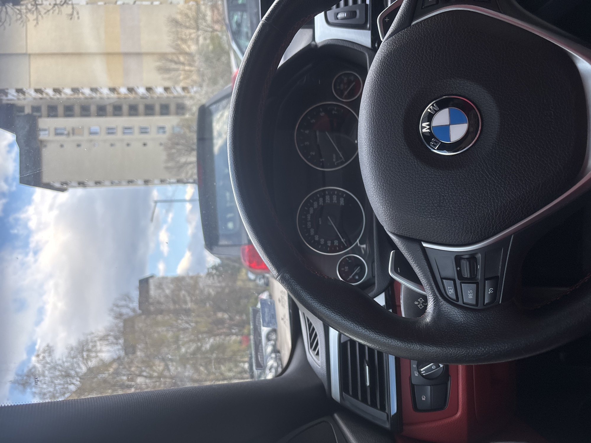 interior of a BMW car, focusing on the steering wheel with the BMW logo. The dashboard and central console are partially visible, featuring a red interior trim. The car is stationary, as indicated by the view through the windshield. The background reveals an urban environment, with a tall, light-colored building featuring rows of windows, typical of residential or office buildings. Other cars are visible parked on the street. The scene is located in Sofia, Bulgaria.