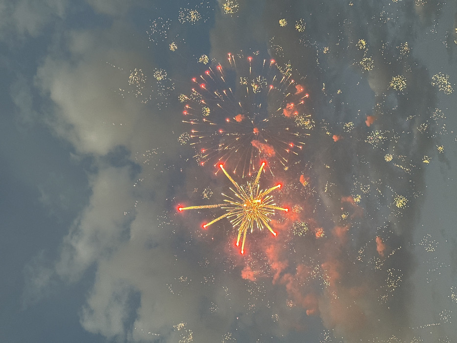 Two fireworks explode in the night sky, amidst hazy clouds. The lower firework is a vibrant gold with distinct red tips. Above it, a more diffuse, red-toned firework blooms. Smaller bursts of gold fireworks scatter around them, creating a celebratory atmosphere. The overall scene conveys a sense of spectacle and excitement.