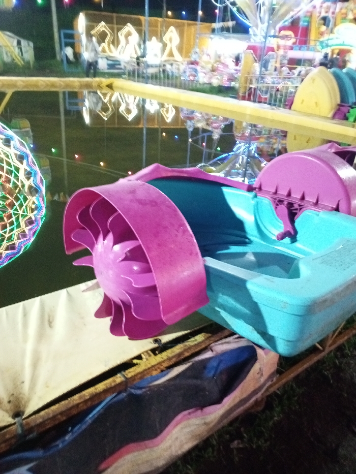 A teal and pink pedal boat sits near a body of water. The boat has a pink paddle wheel on one side and a pink seat back. The boat rests on a rusty metal frame covered with fabric. Lights in the background shine on a fair or carnival with rides.
