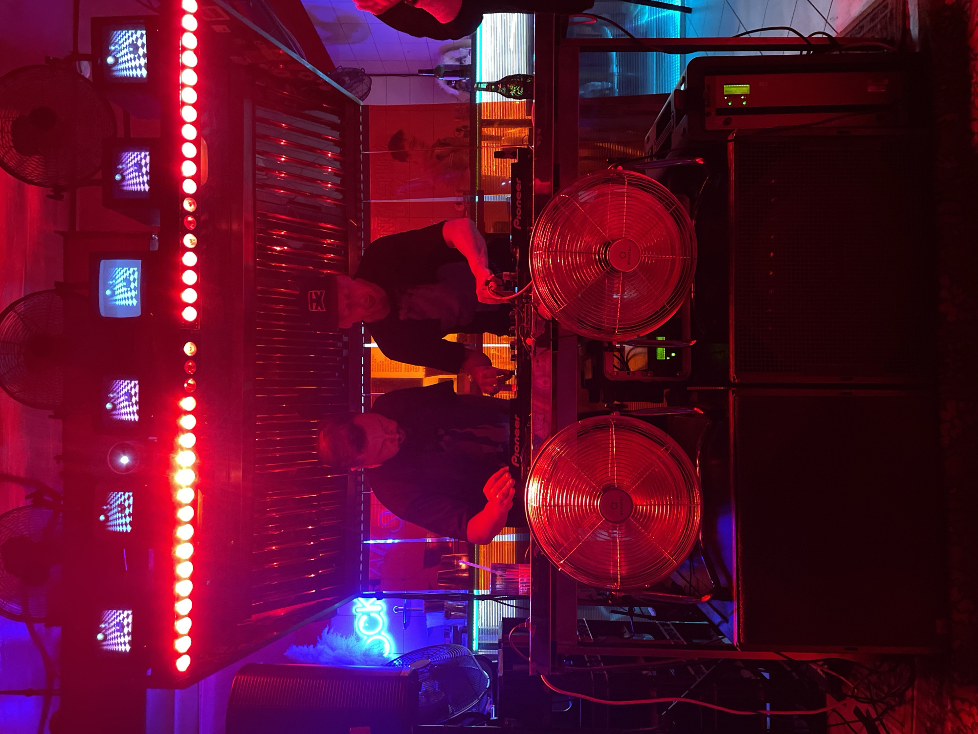 The scene depicts an electronic music performance at Agat Techno Bar in Moscow, Russia. Two adult males are positioned behind a metal-framed DJ booth, actively operating Pioneer DJ controllers and mixers. The individual on the left wears a dark t-shirt and manipulates the left deck; the individual on the right wears a dark t-shirt and a dark baseball cap with a white logo, engaging with the right deck. A drink in a glass with a straw rests on the table near the left DJ. The venue is illuminated predominantly by intense red and blue neon lighting, contributing to a dark, club-like atmosphere. Above the DJs, a prominent horizontal strip of bright red LED lights extends across the upper frame, positioned beneath three small, mounted CRT monitors displaying a repeating 3D checkerboard pattern with a bouncing sphere. Multiple dark, caged industrial fans are mounted on the ceiling, with a large metal industrial exhaust hood situated directly above the DJ setup. A blue neon sign displaying the partial text "OCK" is visible on the far left of the background. In the immediate foreground, two large, round, metallic industrial fans, their blades glowing red from the ambient light, are placed on top of two dark speaker cabinets. An electronic rack unit with a green display is visible on the right, adjacent to a speaker. The background features a reflective surface, behind which a bar counter with various bottles and glasses is discernible. A partially visible individual's arm and shoulder are present on the far right, and a blurry reflection of another person is visible through the background partition.