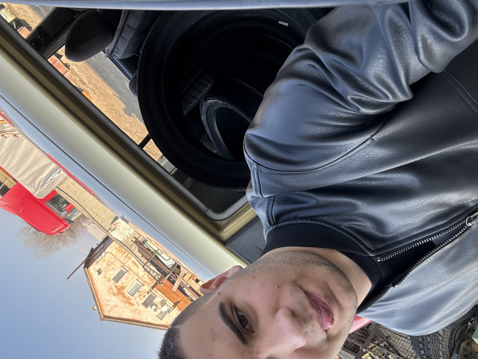 An outdoor, slightly tilted selfie-style image depicts a male subject partially inside a vehicle, with a background scene in Trud, Bulgaria, under a clear blue sky. The subject, a male with short dark hair, dark eyebrows, and visible stubble, is positioned in the left foreground, looking towards the camera with his tongue slightly extended between his lips. He wears a black zippered faux leather bomber jacket over a black t-shirt. He is situated within what appears to be the interior of a vehicle, possibly an older model, evidenced by a light beige/tan roof liner or door frame visible horizontally in the mid-ground. Behind the subject, inside the vehicle's cargo area or backseat, several dark vehicle tires are stacked and visible. The background shows an outdoor environment. To the left, an old, two-story building with a faded orange/peach stucco facade and a brown tiled roof is visible. It features multiple rectangular windows and two external air conditioning units. A wooden structure, possibly a balcony or scaffolding, is attached to its side. A dirt or gravel ground surface is illuminated by sunlight. To the right of the building, a portion of a red semi-truck cab is visible, partially obscured, suggesting an industrial or automotive yard. Bare tree branches are visible against the clear blue sky. Metallic debris is present in the lower left corner of the frame.