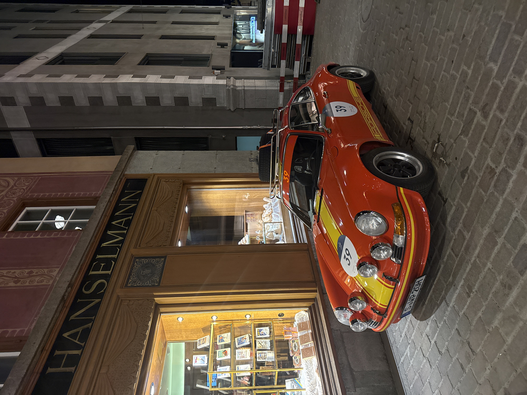 The image displays a red vintage Porsche 911 rally car parked at night on a cobblestone street in Sankt Moritz, Switzerland. The car features prominent yellow racing stripes across its hood, roof, and side sills, along with white circular decals bearing the number "39" on the hood and driver's side door. Four auxiliary rally lights are mounted on its front bumper, and a chrome roof rack carries a spare tire secured by orange straps. The front license plate reads "S WP 20H". The vehicle is positioned directly in front of the Hanselmann confiserie, whose illuminated display windows showcase various confectionery items and packaged goods. The storefront signage prominently displays "HANSELMANN" in gold lettering against a dark fascia. Above the sign, the building features a reddish-brown stucco facade with decorative patterns and white-framed windows. To the right of Hanselmann, a multi-story building with a grey, stone-block facade, characterized by geometric decorative patterns on its corners, rises into the dark background. Red and white striped construction barriers, bearing the name "LAZZARINI", are visible on the far right of the scene. No individuals are present.
