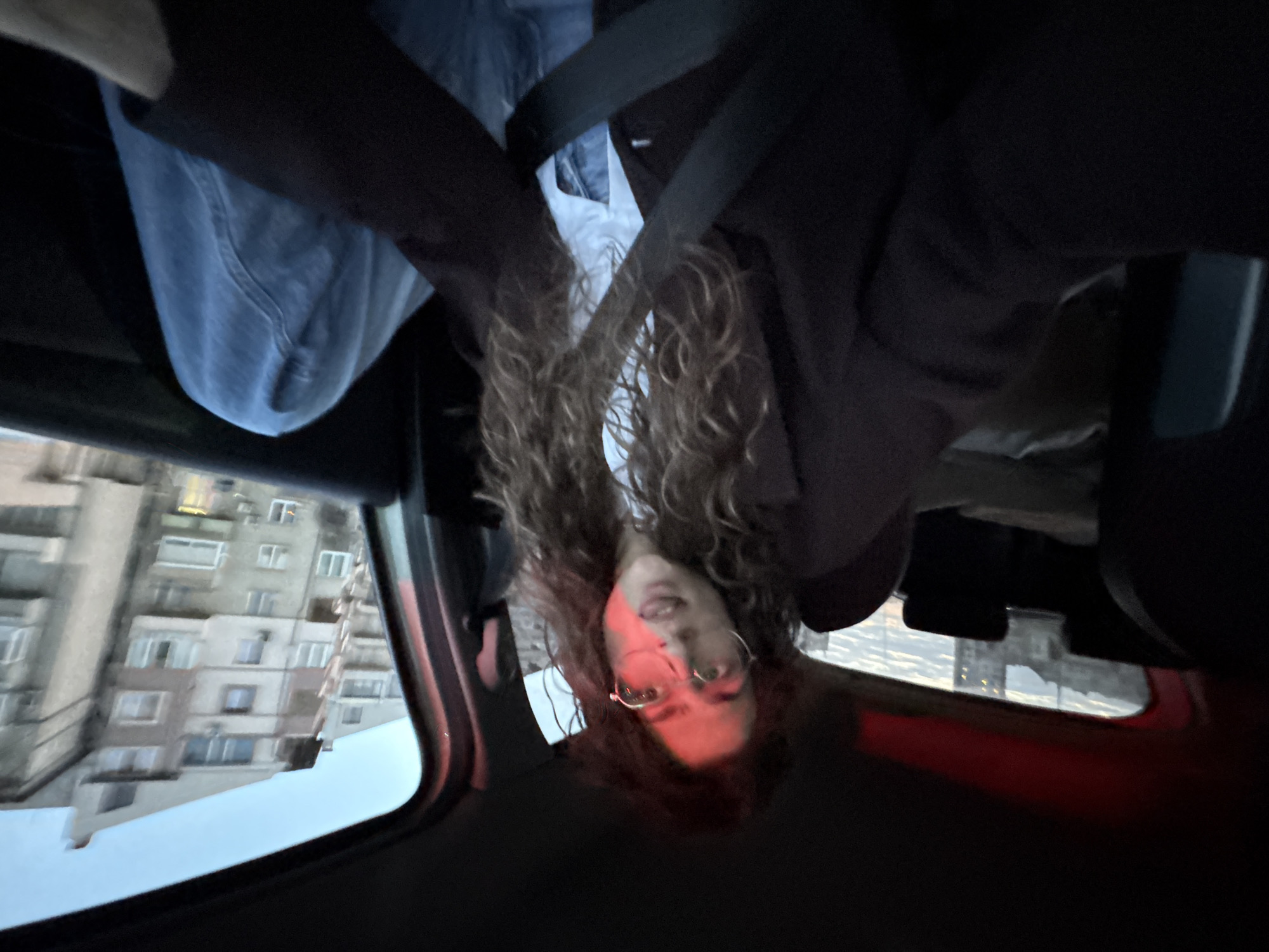 An individual with long, curly brown hair and glasses is seated in the passenger side of a vehicle, secured by a dark seatbelt