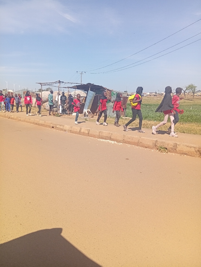 - "The image captures a group of approximately 15 to 20 individuals, predominantly children and young adults, walking in a generally eastward direction along the unpaved shoulder of a light brown asphalt road in Bukuru, Nigeria" by FM-dcKY72, licensed under CC BY 4.0