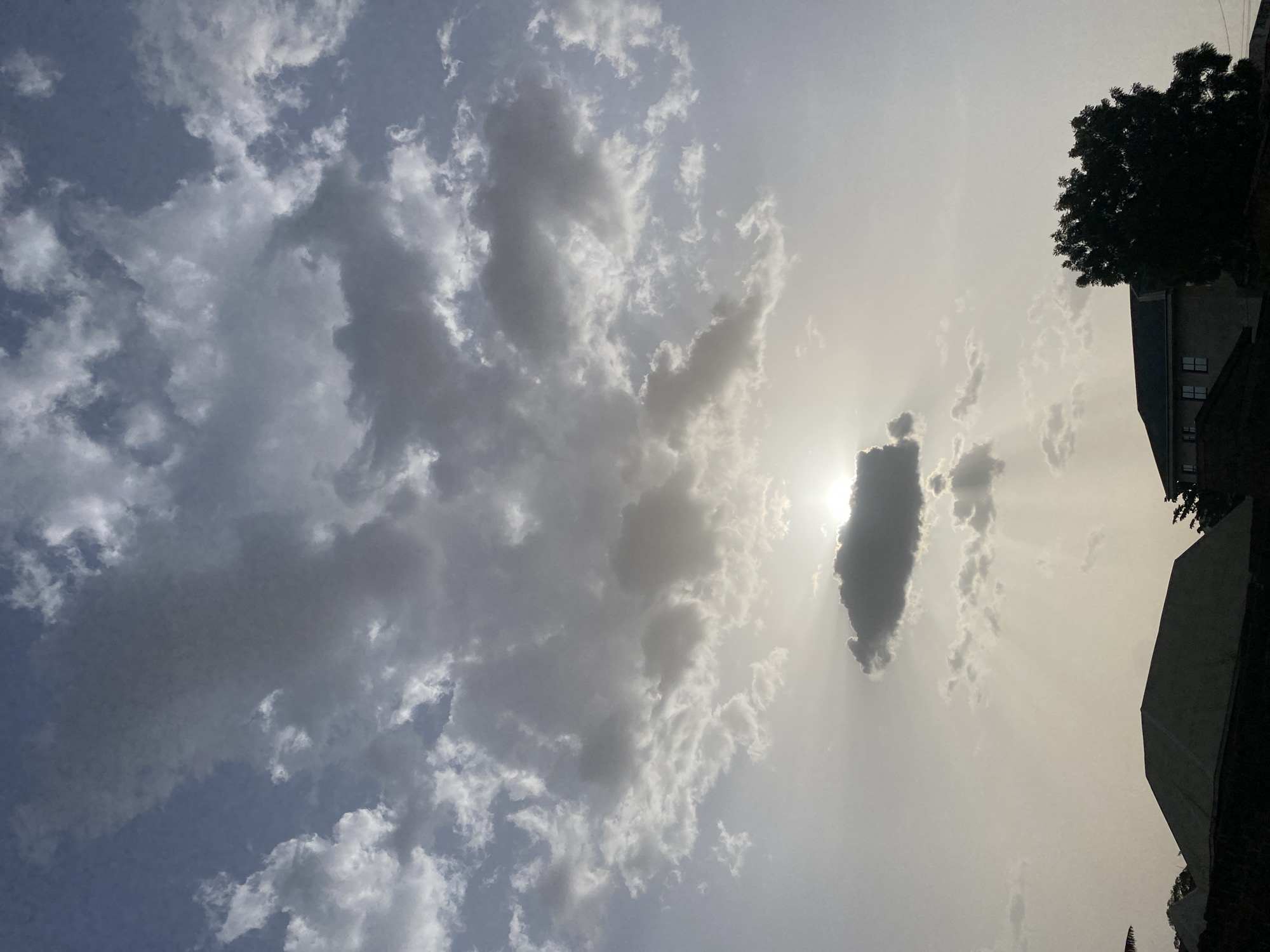 daytime sky, potentially in Rido, Nigeria. The sky contains a mix of cumulus clouds and thinner, veil-like clouds. The sun is obscured by one of the thicker clouds, creating sunbeams. Some buildings and trees are visible in the lower right of the frame. The image is rotated counter-clockwise.