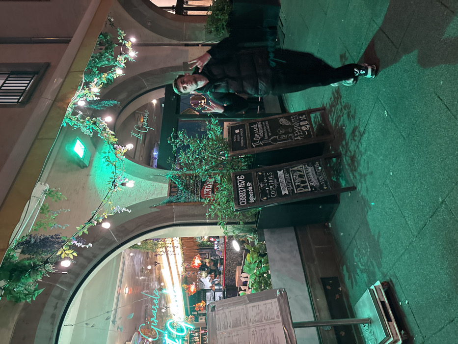 This image captures an evening scene in front of "Il Girasole," a restaurant located at 1 Rue des Mineurs, Strasbourg, France. A single Caucasian male, appearing to be a young adult, stands slightly to the right of the frame's center, facing directly forward. He is dressed in a dark puffer vest over a dark long-sleeved garment, dark trousers, and athletic shoes with light-colored soles. Both his hands are raised, each forming a "rock-on" gesture with extended index and pinky fingers. The restaurant facade features multiple arched openings, including a main entrance and large windows revealing the interior. The arches above the entrance and windows are decorated with string lights intertwined with artificial green foliage and purple flowers. A neon sign spelling "Il Girasole" is visible inside the left window, which displays a warmly lit interior with various decorative elements. A bright green rectangular light fixture is mounted on the facade above the entrance. On the sidewalk to the left, a silver-colored menu stand on a wheeled base, resting on a small wooden pallet, presents a detailed menu. Two dark A-frame chalkboard signs stand side-by-side in front of the restaurant. The left sign displays "0388371676 ilgirasole.fr" and lists menu categories including "COCKTAILS," "PASTA," and "PIZZA." The right sign advertises "PIZZA / PASTA / POISSON / VIANDE" and "À EMPORTER -20%" (takeaway discount). Two dark rectangular planters containing green plants are positioned between these signs and the building. The foreground sidewalk is distinctly illuminated by a strong green light, which casts shadows behind the subject and the signs. The background beyond the restaurant shows parts of an adjacent building with a dark window and a metal balustrade.