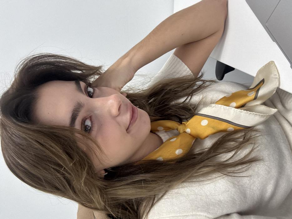 A young adult female is depicted in an indoor setting, looking directly at the camera with a slight smile. She has long, wavy brown hair with lighter highlights and is wearing a cream-colored, short-sleeved top. A yellow silk scarf with white polka dots and a cream and grey border is tied around her neck. A small hoop earring is visible in her left ear. Her left elbow rests on a white desk or table surface, with her left hand positioned near her face. A portion of a silver laptop is visible on the desk in the lower right foreground. A dark office chair back is partially visible behind her left arm. The background is a plain white wall, indicating a minimalist or office environment. The scene is located in the city of Torres Vedras, Portugal.