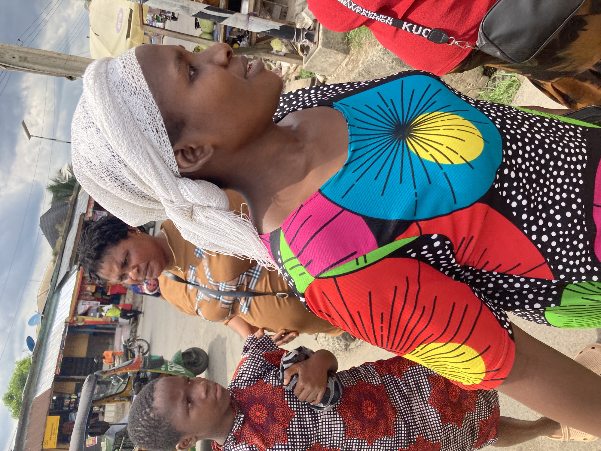 The image depicts a street scene in Aba, Nigeria. Three women are visible, two in the foreground and one slightly behind. The woman in the immediate foreground wears a colorful dress with a white headscarf and is looking upwards. Adjacent to her, a younger woman is looking straight ahead and is holding a gray and black object. Behind them, another woman stands looking at the ground. In the background are buildings and structures, as well as a yellow tricycle. A telephone pole is visible on the left.