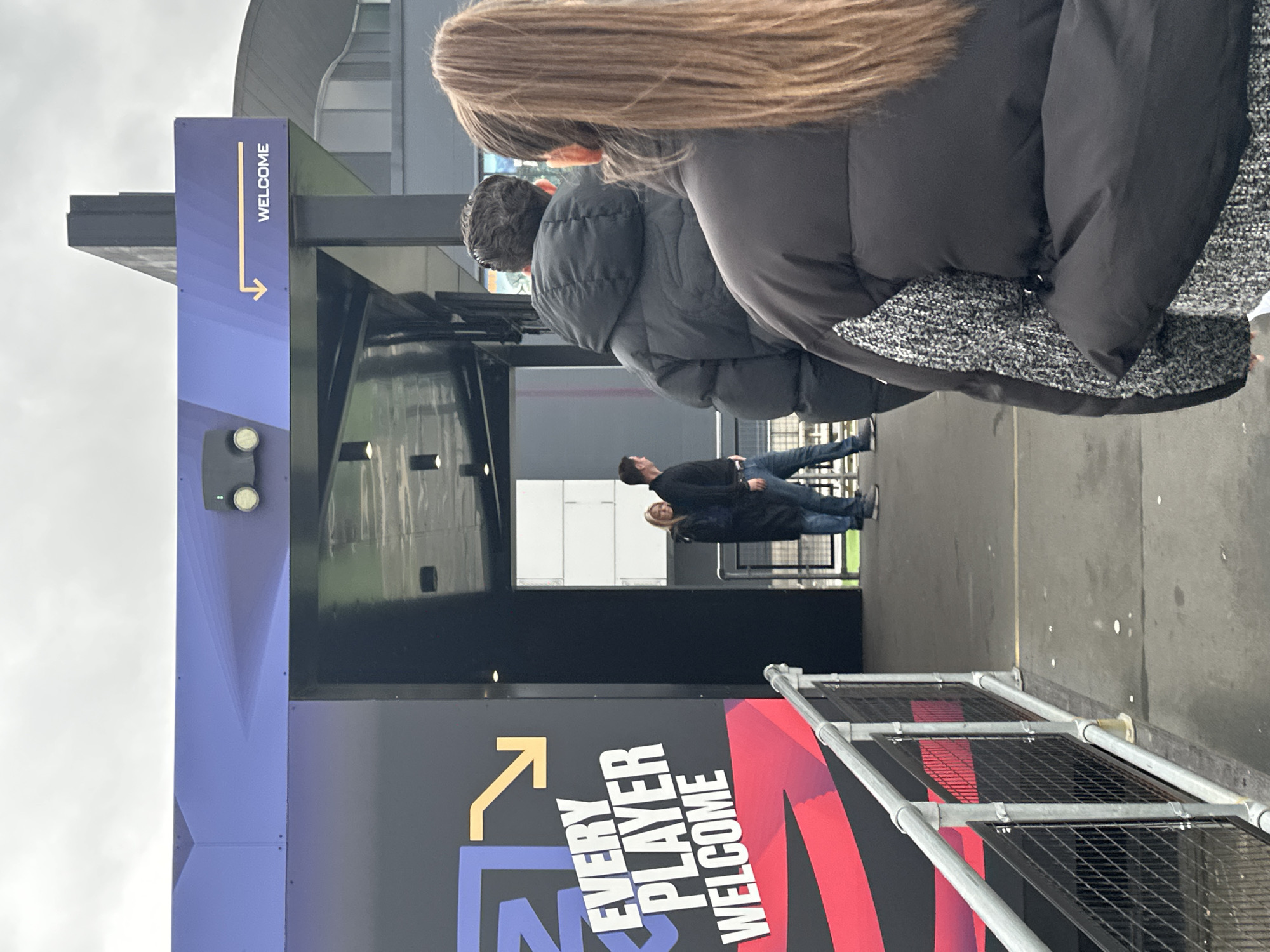 The image captures a scene at a venue in Dartford, United Kingdom. The foreground features a blue and black sign with "WELCOME" printed vertically, and "EVERY PLAYER WELCOME" displayed prominently, along with arrow graphics. A metal barricade is visible near the bottom of the frame. Further back, there are people walking through an entryway, including a couple and other individuals in dark clothing. One person in the foreground is wearing a thick black jacket. The architectural design of the building is partially visible in the background. The weather appears overcast, with a gray sky.