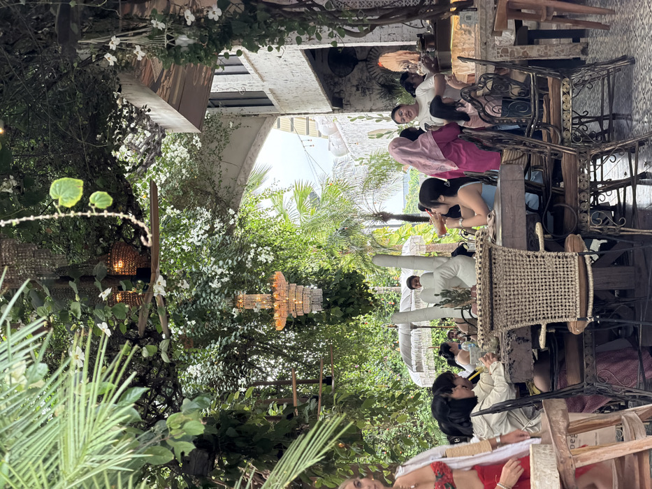A lively outdoor scene depicts a group of people dining amidst lush greenery. Tables and chairs are arranged within a garden-like setting, featuring tropical plants, white flowers, and decorative chandeliers. Diners are engaged in conversation and enjoying refreshments. The scene exudes a vibrant, social atmosphere within a natural, yet stylish environment.